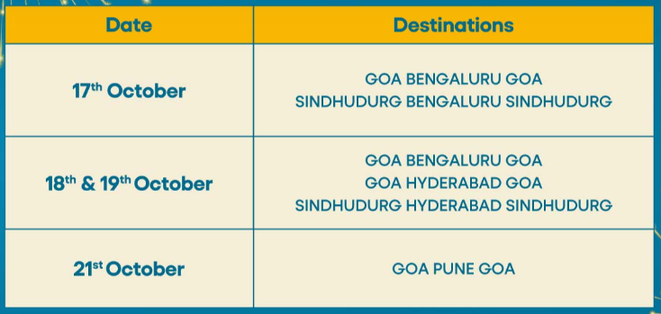 - October 18 & 19: Goa–Bengaluru–Goa, Goa–Hyderabad–Goa, and Sindhudurg–Hyderabad–Sindhudurg