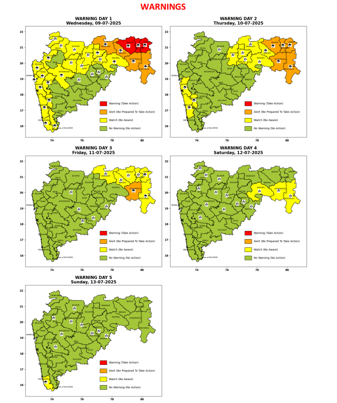 - Amravati and Wardha: Heavy rain warnings for July 9 and 10.