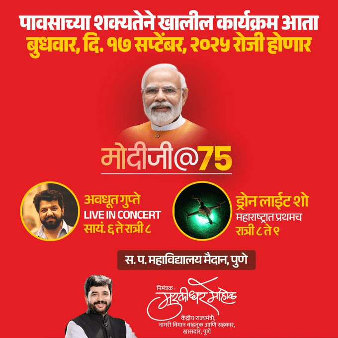 Pune, September 15, 2025: Pune is all set to host a spectacular drone light show on the evening of September 17 to celebrate Prime Minister Narendra Modi’s 75th birthday. The event, organised by Union Minister Murlidhar Mohol, promises to be a visual treat and marks a milestone for Maharashtra.