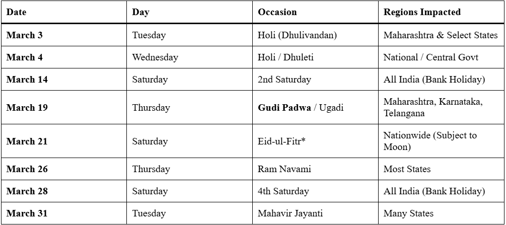 - March 3 (Tuesday): Banks will remain closed in Maharashtra (Mumbai, Pune, Nagpur, Belapur), West Bengal (Doljatra), and Rajasthan.