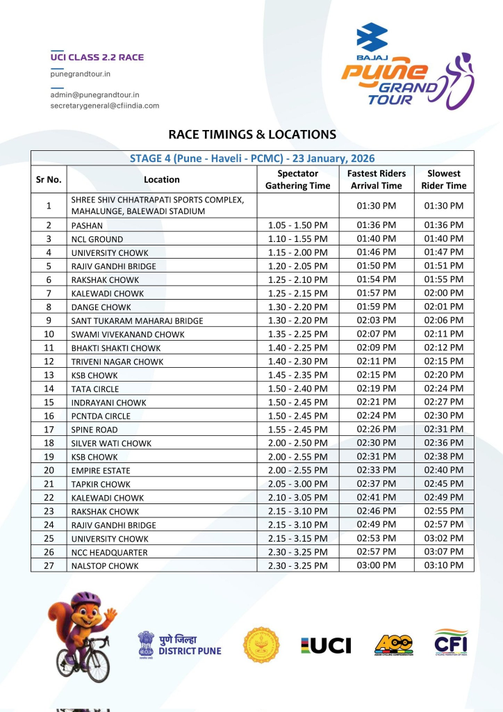 Pune, January 22, 2026: The city is set to witness the final leg of the prestigious Bajaj Pune Grand Tour (BPGT) 2026. As Stage 4 of the cycling tournament kicks off on Friday, January 23, 2026, the Pune City Traffic Police have announced extensive traffic diversions and temporary road closures across major arterial routes to ensure the safety of participants and commuters.