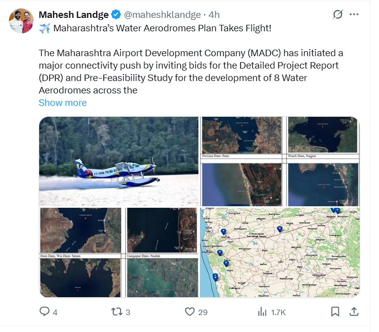 The Maharashtra Airport Development Company (MADC) has taken a major step towards boosting regional connectivity by inviting bids for the development of eight new water aerodromes in Maharashtra. These aerodromes aim to promote tourism and enhance air connectivity to remote and scenic areas across the state.
